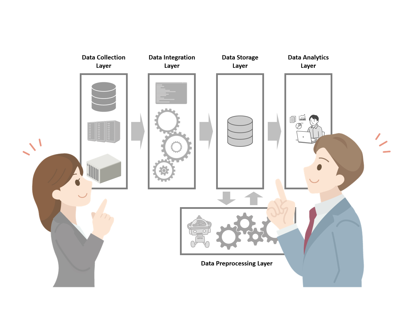 発生したデータが活用されるまでに、例えば、次のような幾つかのレイヤー(層)が必要になります。