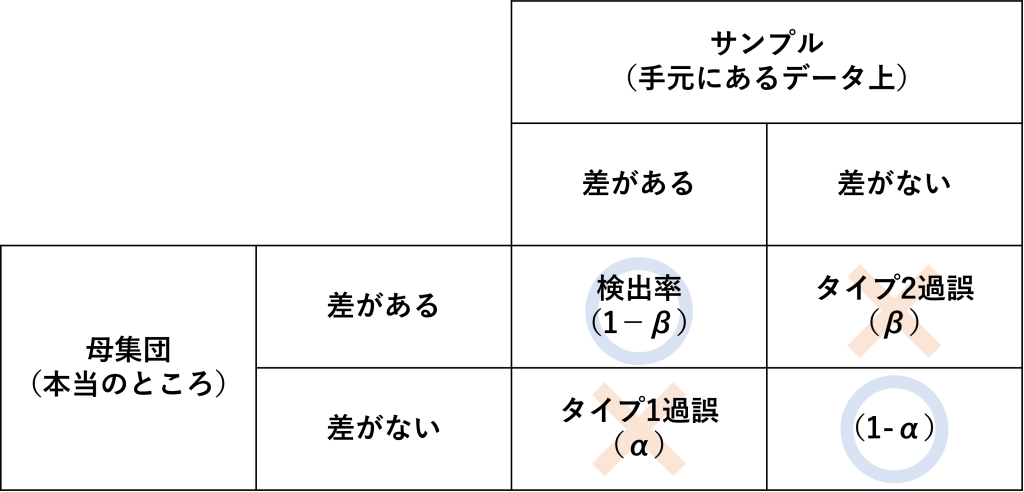 - β:タイプ2過誤の起こる確率、1-βを検出力と言います
