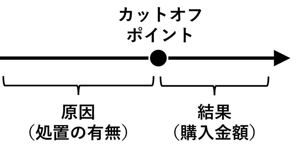 - 処置変数(説明変数として利用):カットオフポイントより前に起こったこと(原因)