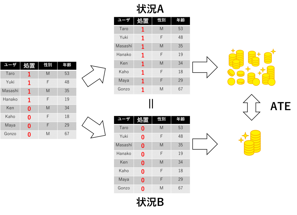 どう言うことかというと、販促効果は「同じような人たちの状況Aの結果(購入金額)と状況Bの結果(購入金額)の差分から考える」ということです。この差分を、平均処置効果(ATE、Average Treatment Effect)と言います。