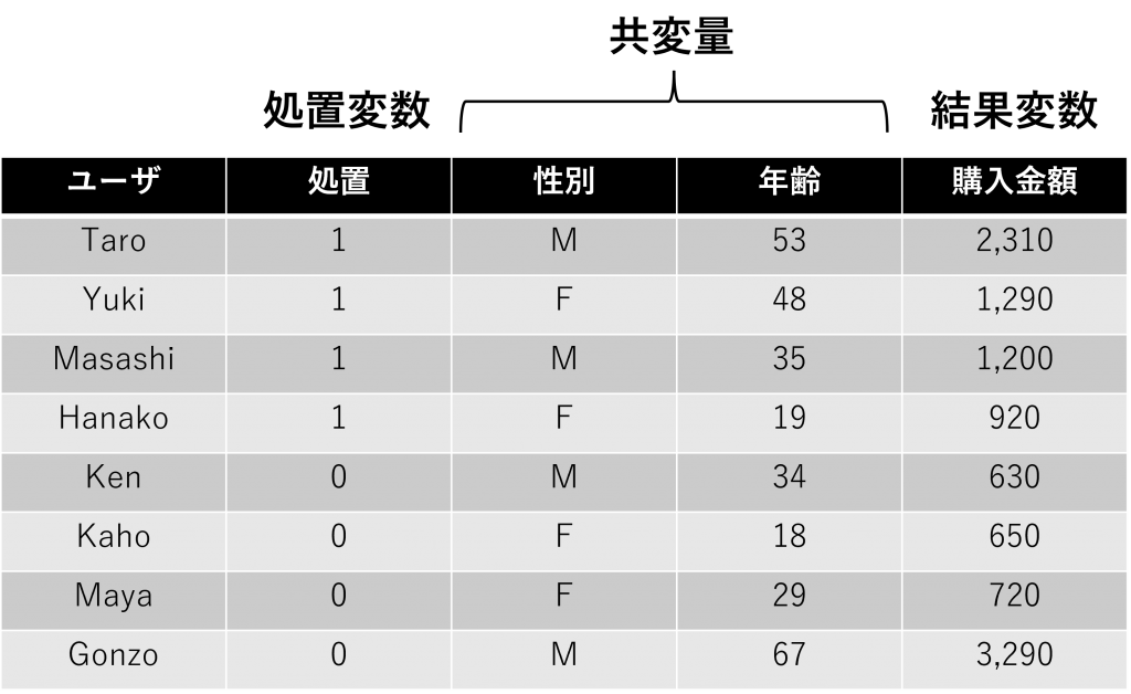 さらに、説明変数にデータに登場する各個人の属性項目(性年代、ライフステージなど)も利用します。共変量と呼ばれることが多いです。