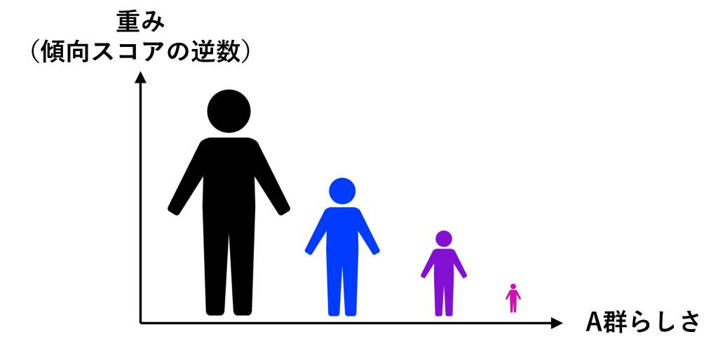 傾向スコアの逆数を重みするということは、A群らしい人のデータの重みを小さくし、A群らしくない人のデータの重みを大きくすることです。