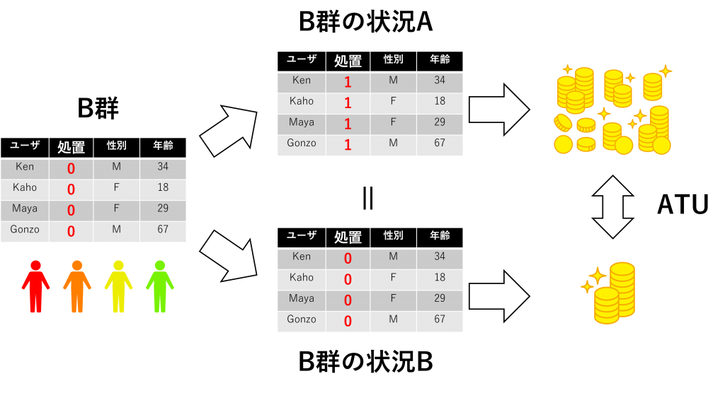 例えば、B群で実施した場合、それはB群に対する機会損失測定になり、統制群における平均処置効果(ATU、Average Treatment effect on the Untreated)と呼ばれます。今後、販促活動をB群へ拡大すべきかどうかの検討などに活用できます。