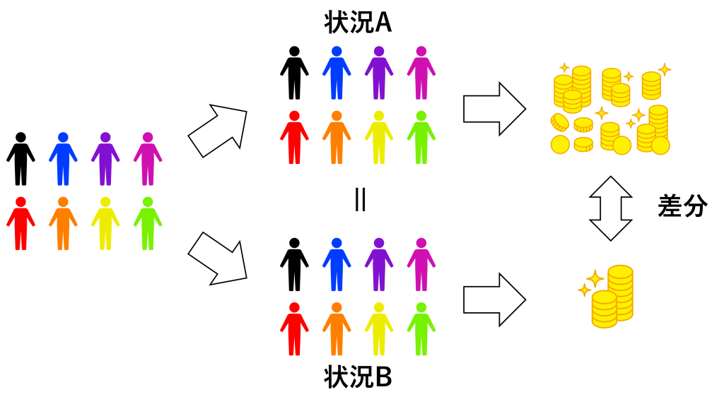 販促効果は、同じ人の状況Aの結果(購入金額)と状況Bの結果(購入金額)の差分から分かります。