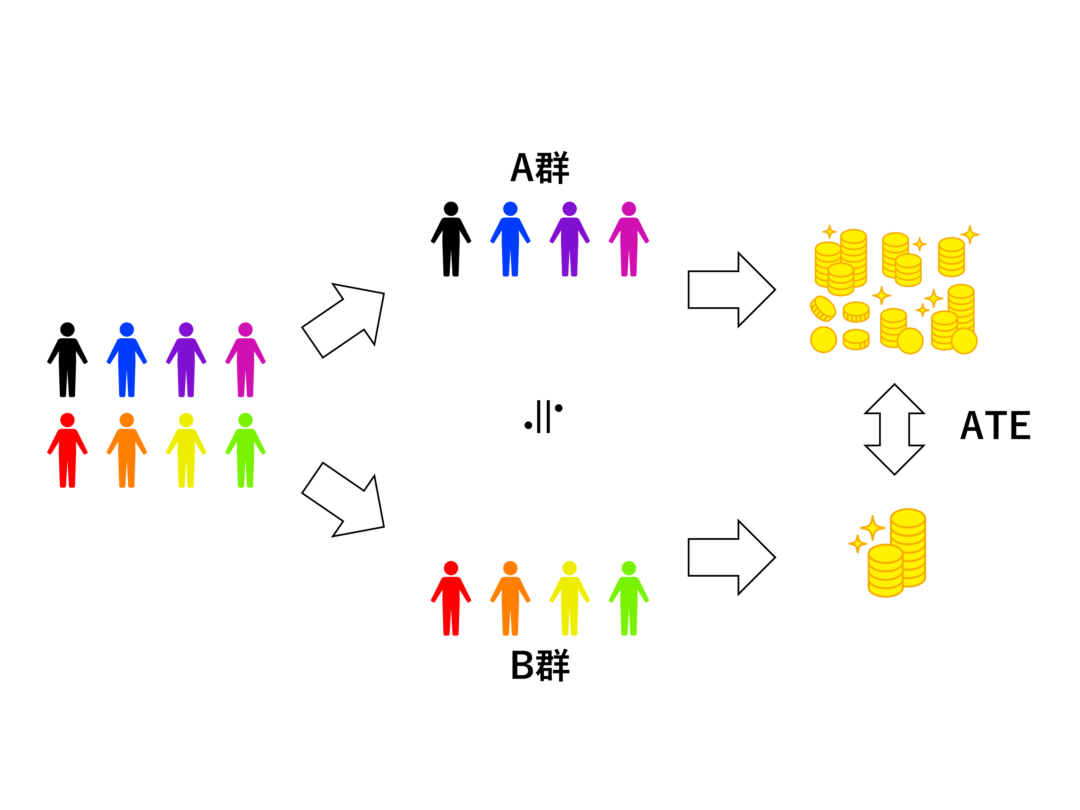 そのためには、A群(状況Aになる人)とB群(状況Bになる人)が同じような人になるようにする必要があります。ランダムアサインメントです。