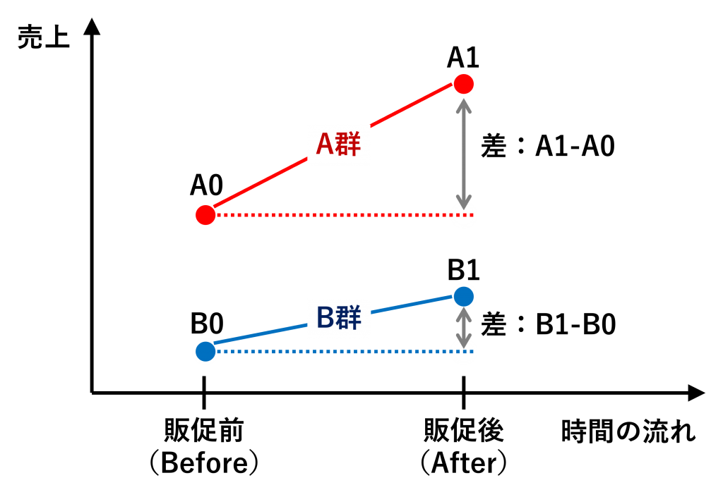 なんとなく、販促を実施したA群の「販促前後の売上の差」だけでもいいのでは、と思われがちですが、販促効果を見積もりたいのなら、それはNGです。