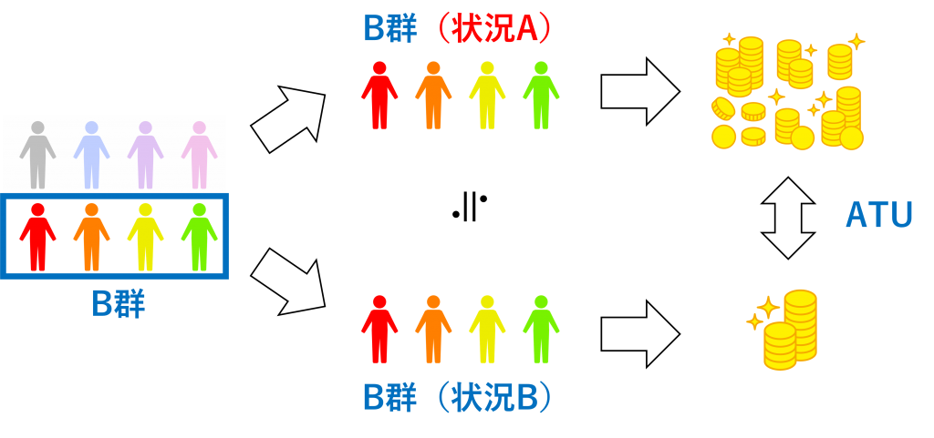 ATUは、統制群であるB群の「状況Aと状況Bの差」つまり「B群(状況A)とB群(状況B)の差」です。B群(状況B)が実際に起こる事実で、B群(状況A)は実際に起こらない反実仮想です。
