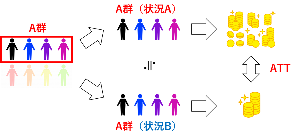 ATTは、「A群(状況A)とA群(状況B)の差」です。そして、反実仮想であるA群(状況B)の値は分かりません。