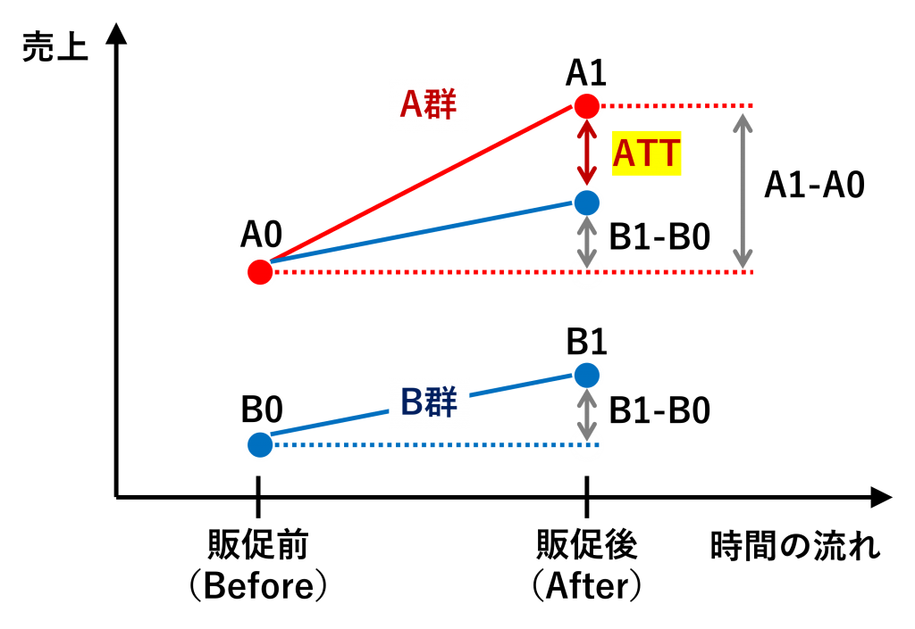 ATT=A群(状況A)のBefore&Afterの差ーB群(状況B)のBefore&Afterの差