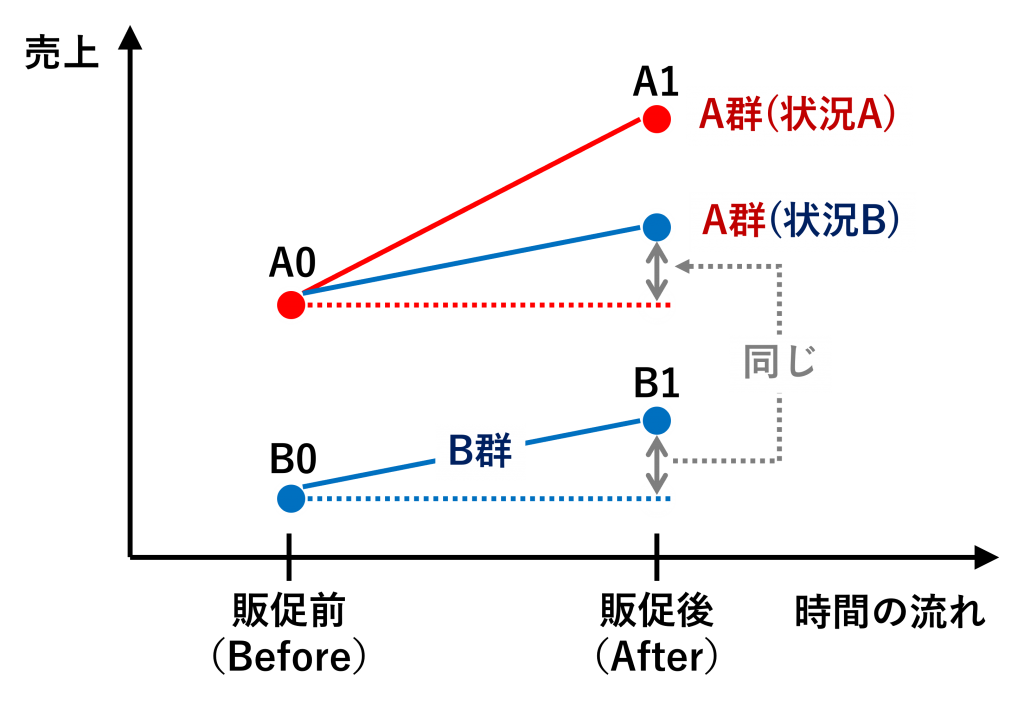 例えば、A群が状況Bのときの「Before&Afterの差」と、状況BであるB群の「Before&Afterの差」は同じとすることです。