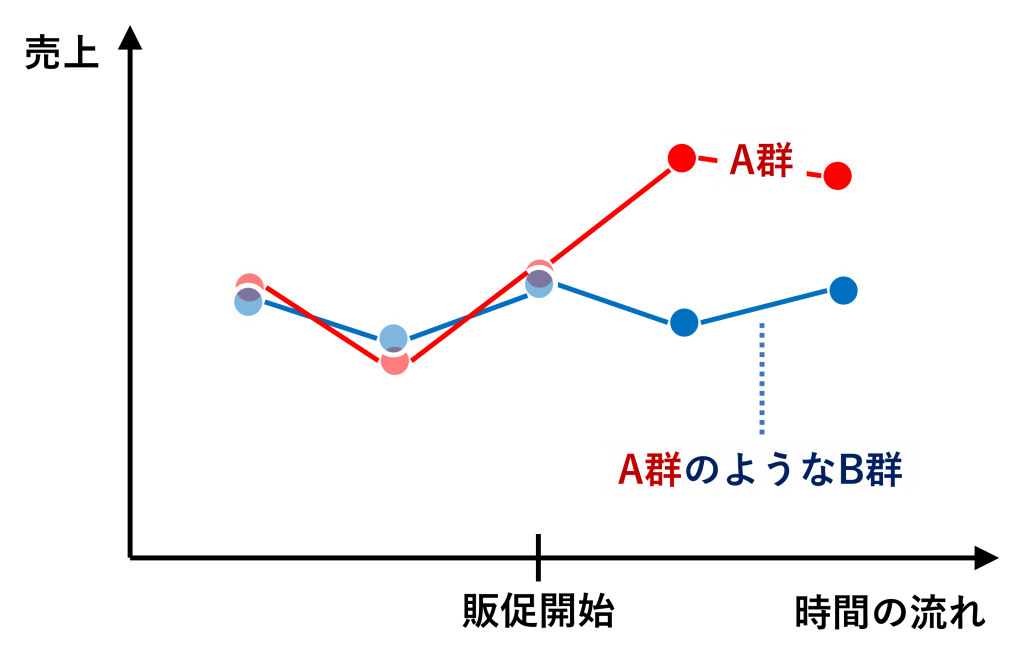 統制群(control group)候補と言っているのは、販促を受けていないB群(統制群)に分類されるデータ群のことです。
