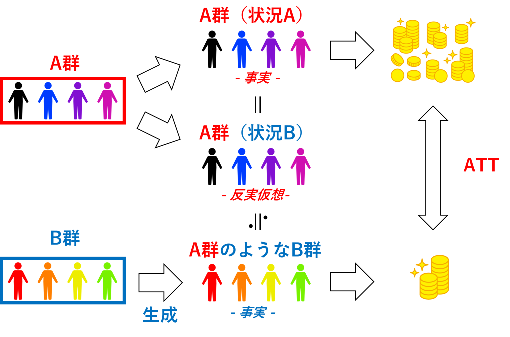 ATTは、処置群であるA群の「状況Aと状況Bの差」つまり「A群(状況A)とA群(状況B)の差」です。A群(状況A)が実際に起こる事実で、A群(状況B)は実際に起こらない反実仮想です。