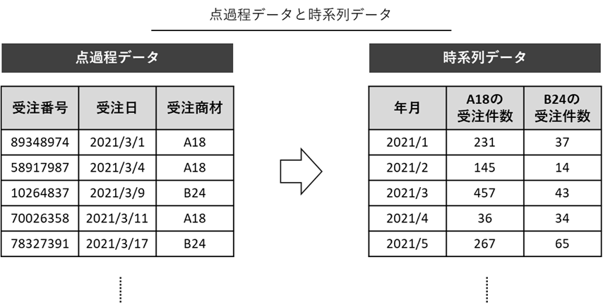 今、点過程データである「受注履歴データ」が手元にあったとします。この受注履歴データから、週単位や月単位、四半期単位などで受注金額や受注件数、受注単価などを計算することができます。この計算し求めたデータは、時系列データになります。