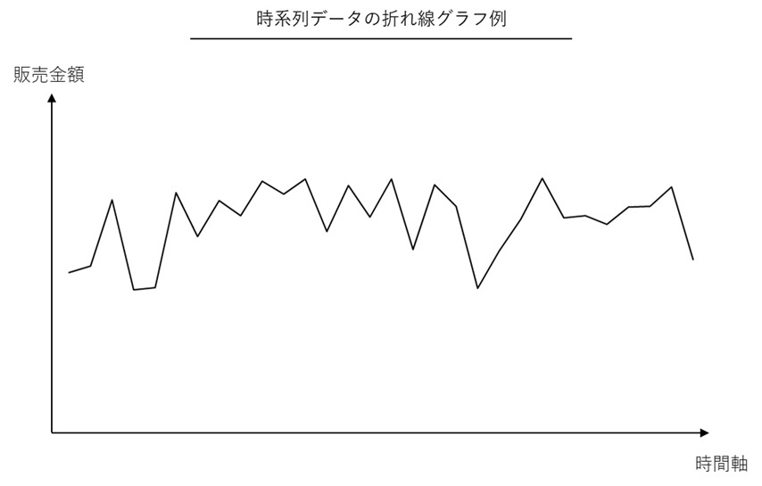 ビジネスの現場でよく見る折れ線グラフです。横軸が時間軸で、縦軸が色々な指標の値の軸(例では「販売金額」)になります。