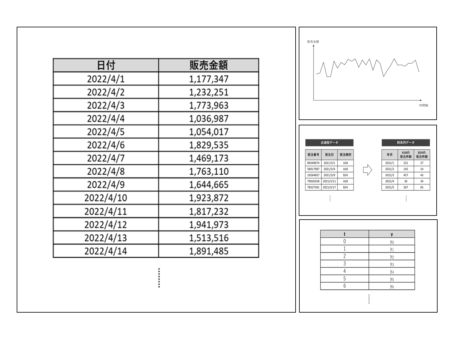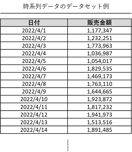 この時系列のデータセットには、「時間を表現する変数」(例では「日付」)と「販売金額の値が入った変数」(例では「販売金額」)が1つずつあります。