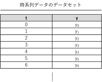 この時系列データを記号で表現すると、変数yのt時点の値をy_tと表現します。