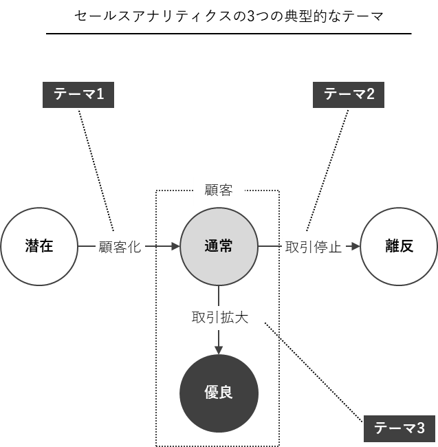 個々の顧客の動きをデータで捉えられるビジネス(例:法人相手のビジネスや、顧客と売上が紐づいたID付きPOSデータを取得できる一般消費者向けビジネス、など)をしているとき、例えば、次のようなセールスアナリティクスの3テーマに直面します。