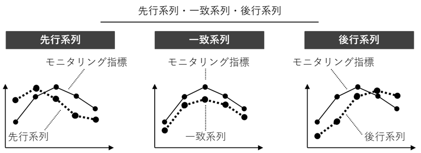 このモニタリング指標と連動している変数には、モニタリング指標と一緒に連動している「一致系列」、モニタリング指標より遅れて動く「遅行系列」、そしてモニタリング指標より先に動く「先行系列」の3種類があります。
