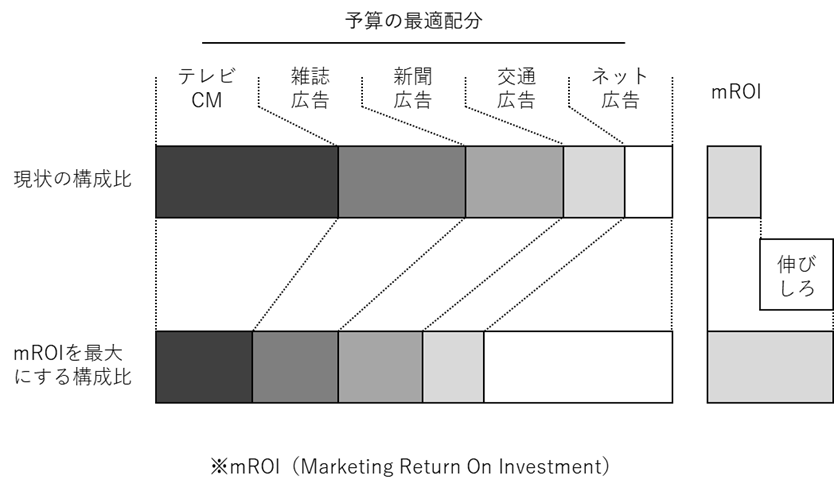 具体的には、時系列の売上データと、時系列の広告・販促関連のデータを利用し、広告・販促の各媒体の売上貢献度やmROI(Marketing Return On Investment)などを算出したり、mROIを最大化する予算の最適配分を割り出したりします。