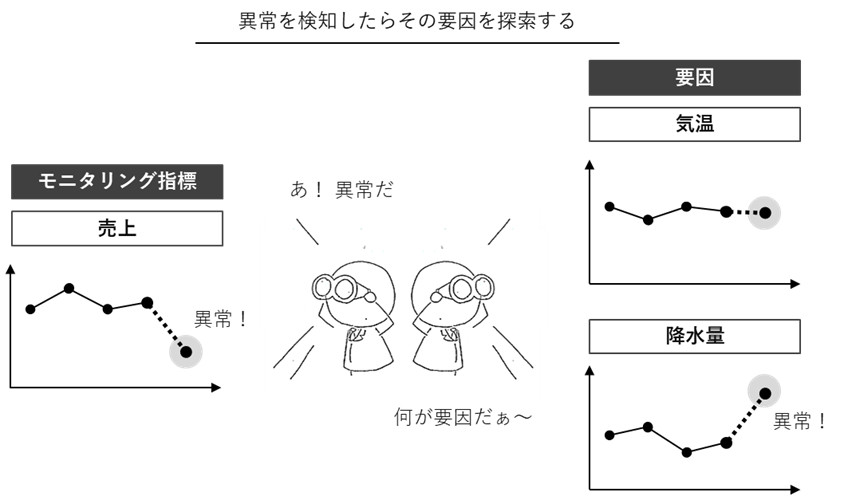 先ずモニタリング指標の「異常検知」を実施し、異常が検知されたらその要因を探るために「要因探索」を実施します。
