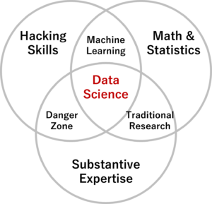 商品開発やCXなどのためにデータサイエンス技術を使い、より良いものにするには、例えばDrew Conway のベン図(2010年に作成され、2013年に一般公開)が参考になります。