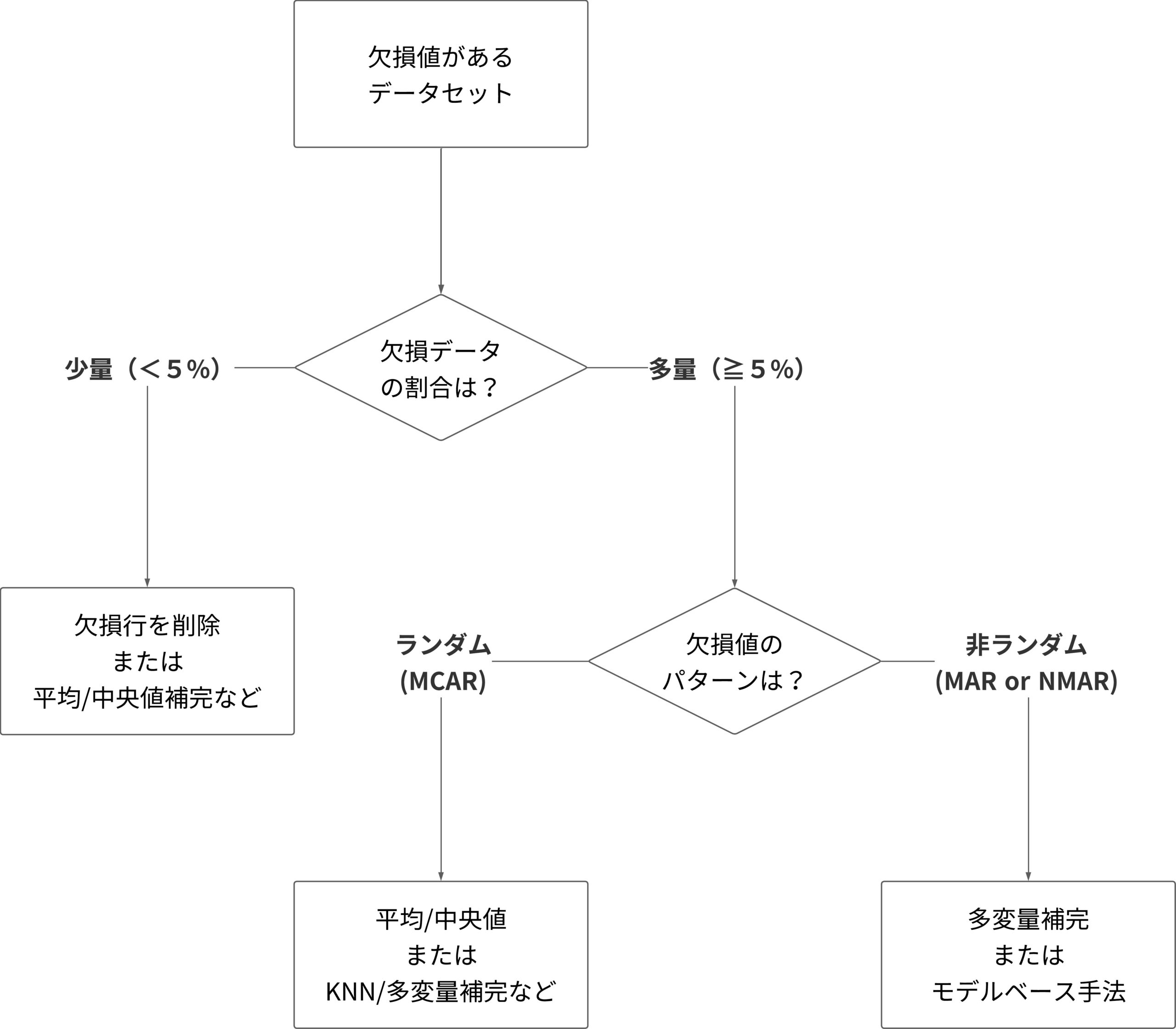 このフローチャートは、欠損データの割合や欠損のパターンに基づいて、行を削除する、変数を削除する、平均値や中央値で補完するなどの選択肢を提供します。