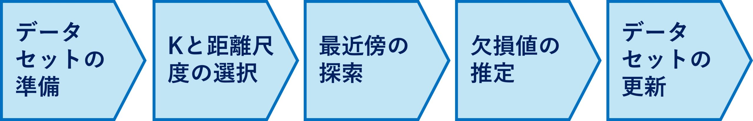 - 最近傍の探索: 欠損値を含む各データポイントについて、選定した距離尺度を用いて、最も近いK個のデータポイント(近傍)を探索します。