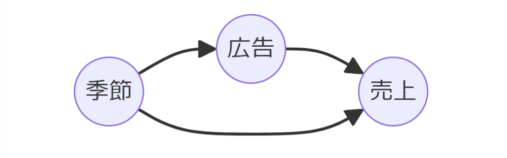 DAGを用いて、広告キャンペーン(A)、売上(B)、季節(C)の関係を描くと、季節が広告と売上の両方に影響を与えていることが明らかになります。
