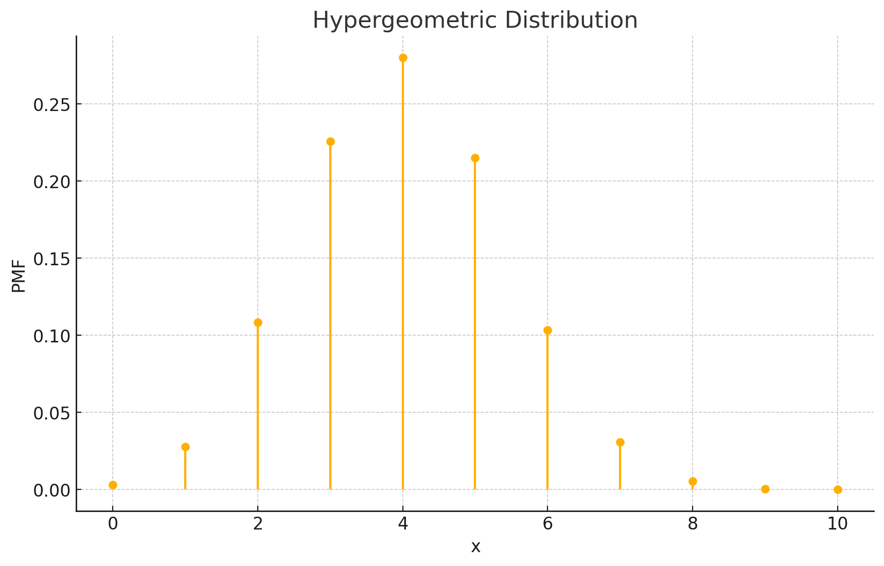 超幾何分布は、有限母集団からサンプリングする際の成功回数をモデル化します。サンプルは置き換えなしで選ばれます。