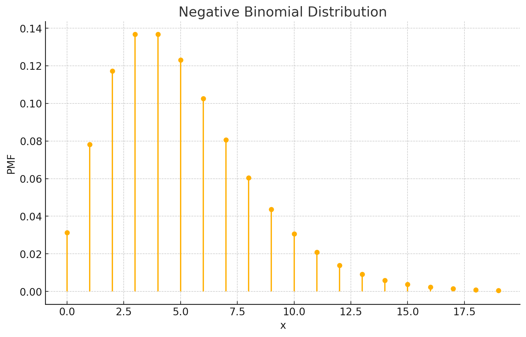 負の二項分布は、k回目の成功までに必要な試行回数をモデル化します。各試行は成功か失敗のいずれかであり、成功の確率は一定です。