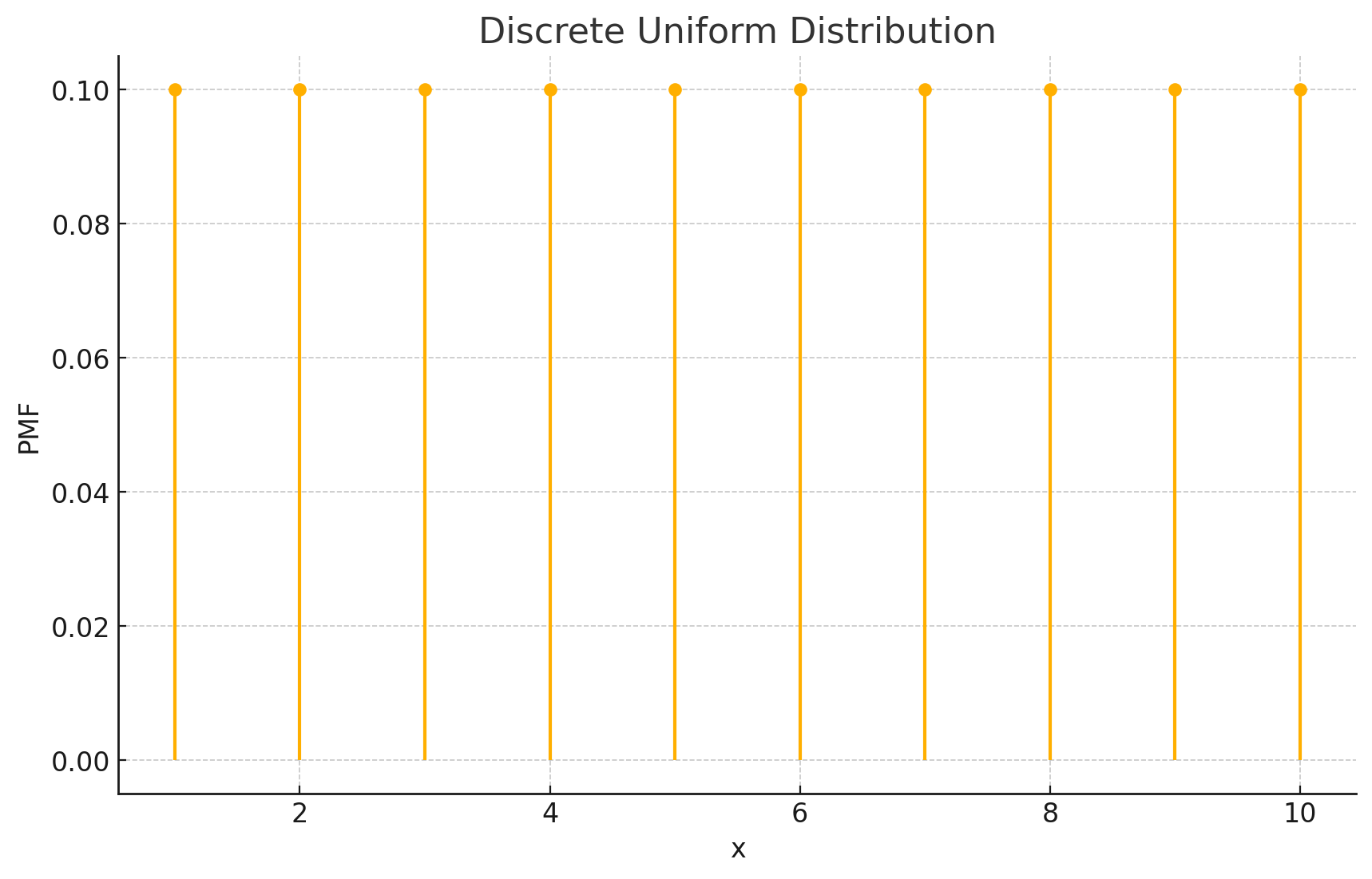 離散一様分布は、全ての結果が等しい確率で発生する分布です。n個の異なる結果がある場合、それぞれの結果の発生確率は1/nです。
