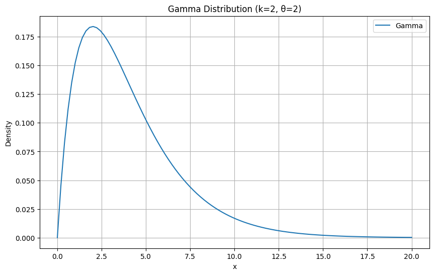 \displaystyle f(x; k, \theta) = \frac{x^{k-1} e^{-x/\theta}}{\theta^k \Gamma(k)} \quad (x \geq 0)ここで、k は形状パラメータ、θ は尺度パラメータ、Γ(k) はガンマ関数です。