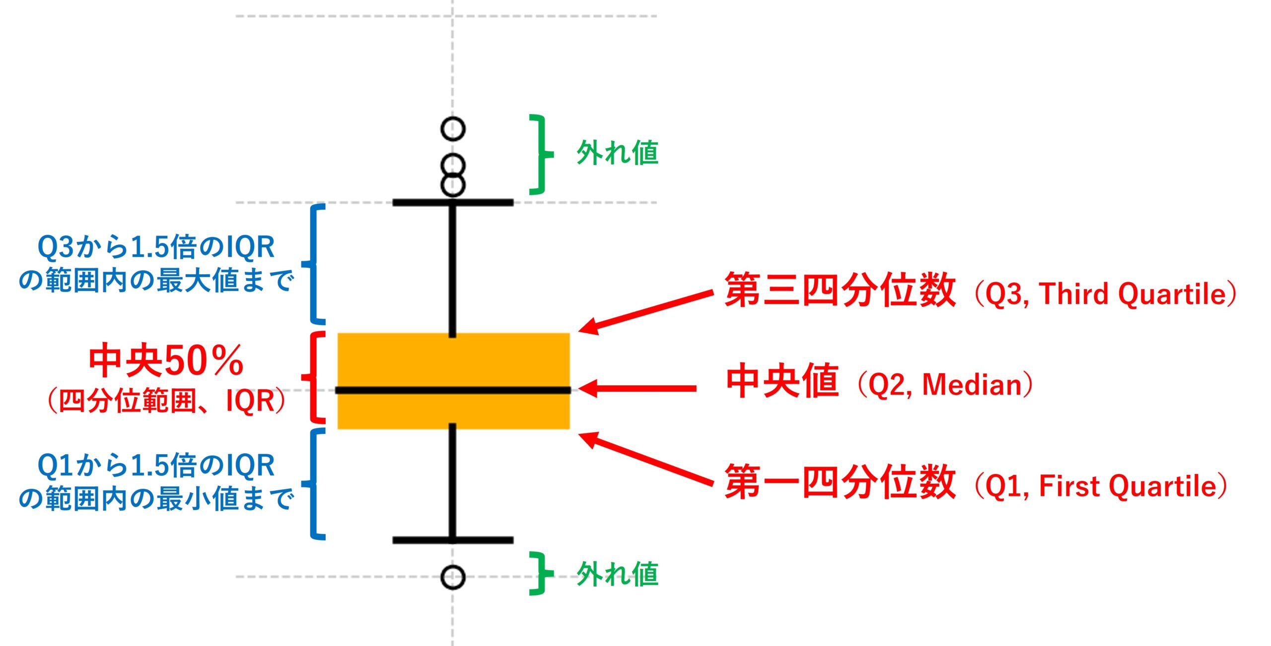 ボックスはデータの中央50%(四分位範囲、IQR)を示します。ボックスの下端は第一四分位数(Q1, First Quartile)、上端は第三四分位数(Q3, Third Quartile)です。ボックス内の線は中央値(Median)を示し、データの中央値を表します。