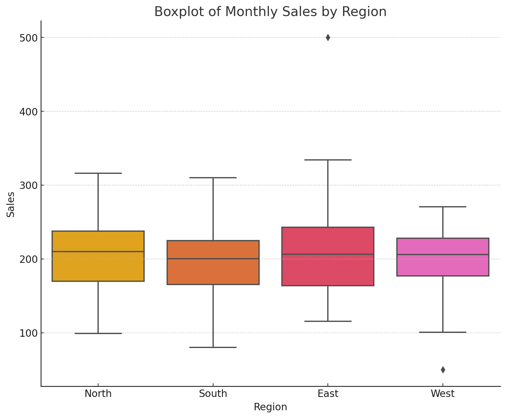 ボックスプロットを使用することで、各地域ごとの売上の分布や異常値を視覚的に確認できます。