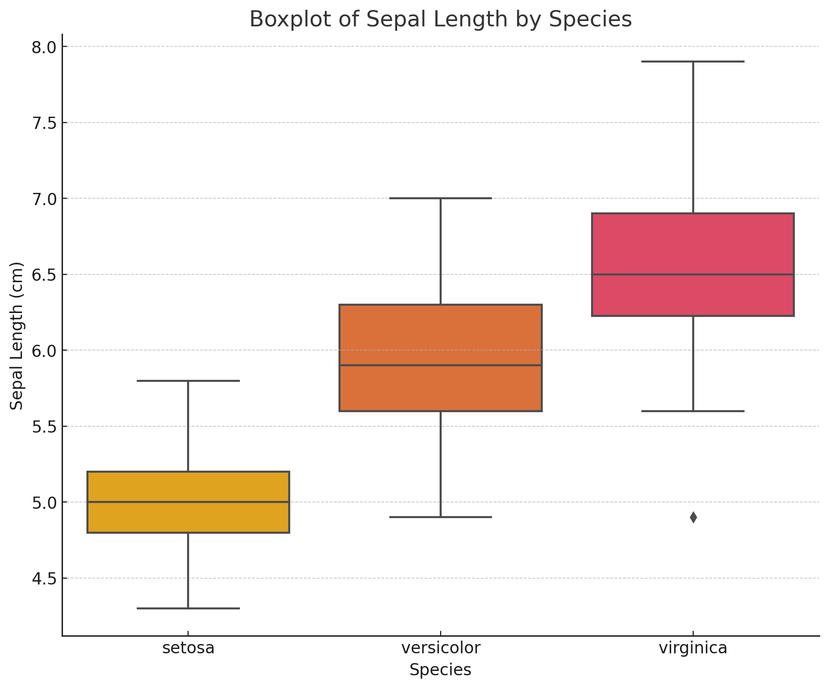 以下は、Irisデータセットの「sepal length(がく片の長さ)」の分布を異なる花の品種(species)ごとに比較したボックスプロットです。