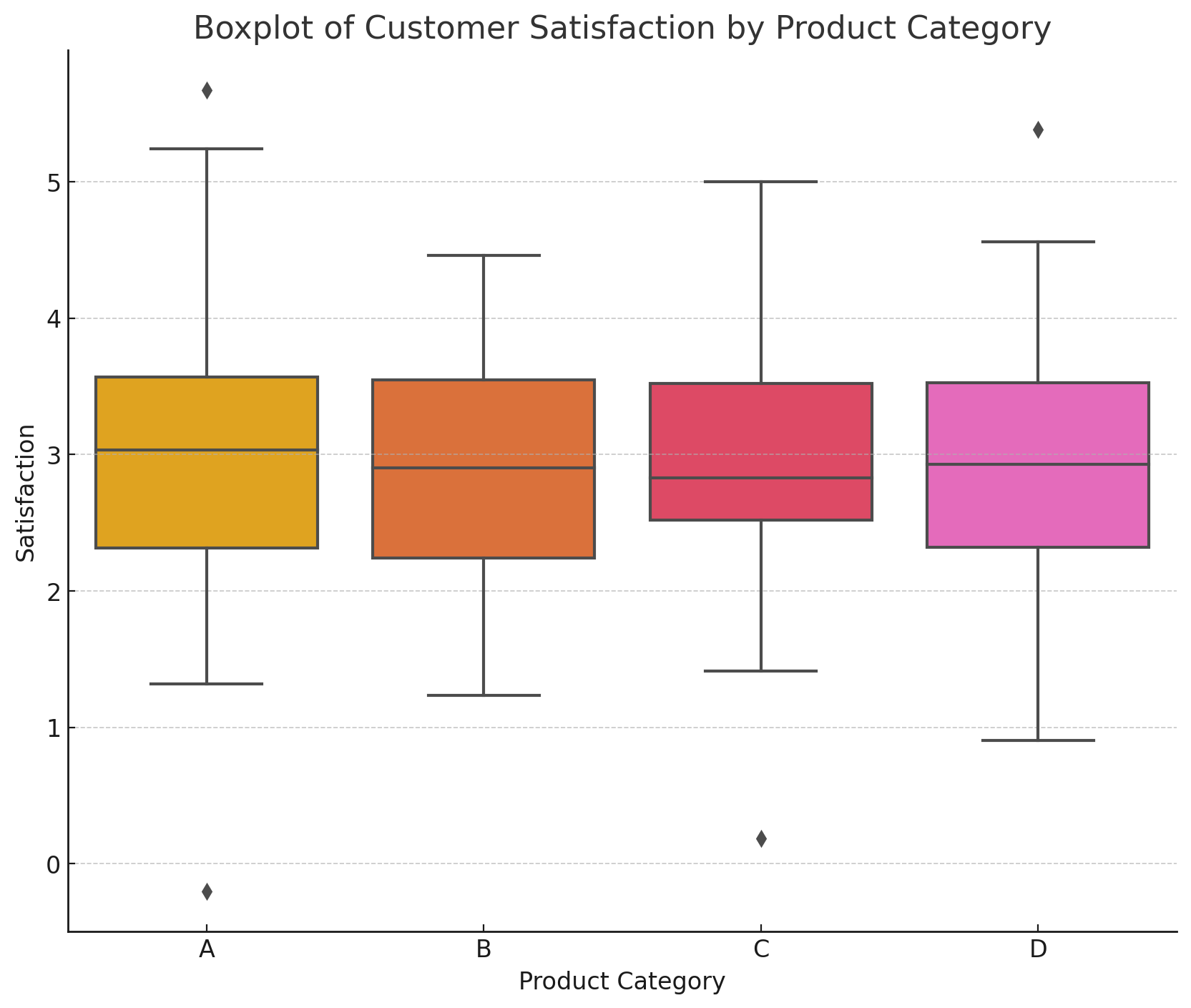 異なる製品カテゴリー(Product Category)ごとの満足度の分布をボックスプロットで比較します。