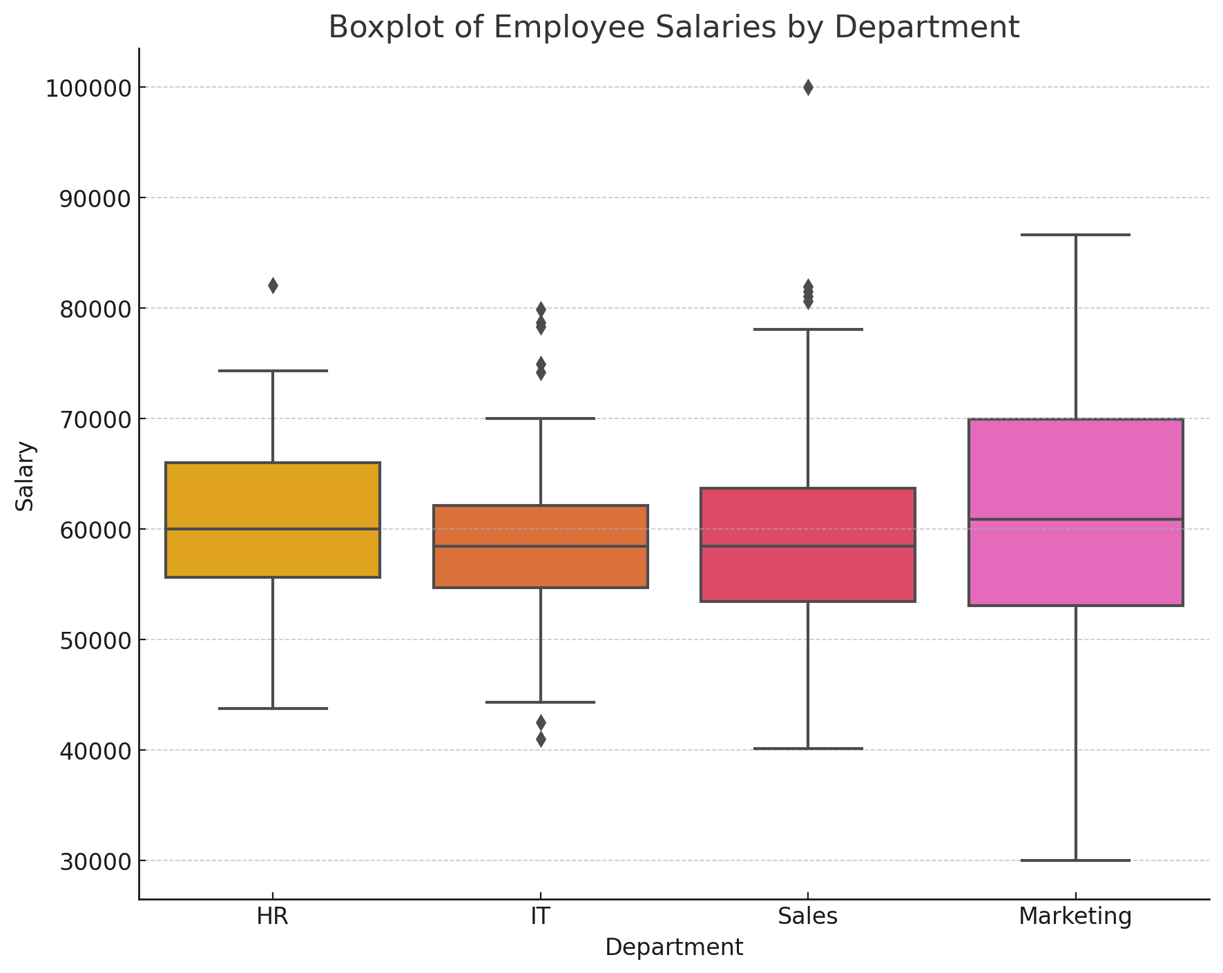 異なる部門(Department)ごとの給与分布をボックスプロットで比較します。