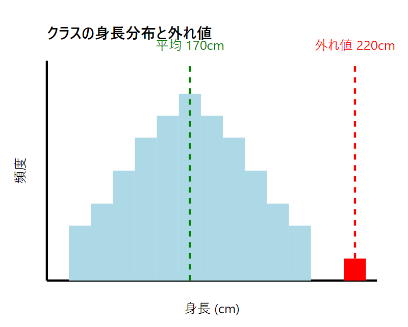 統計学的には、データの分布から大きく逸脱した値として定義されます。例えば、クラスの平均身長が170cmの中で、220cmという身長データがあれば、それは外れ値と考えられるでしょう。