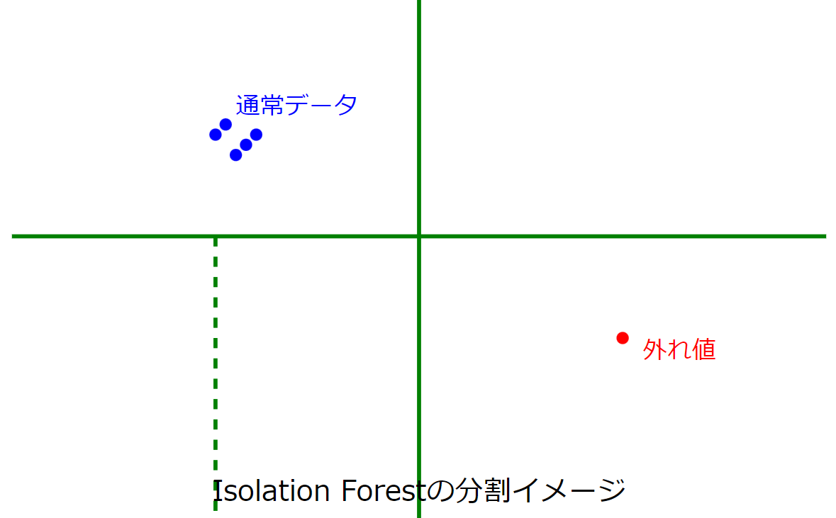 上図は、Isolation Forestの基本的な考え方を示しています。通常のデータ(青い点)は密集しているため、多くの分割(緑の線)が必要ですが、外れ値(赤い点)は少ない分割で孤立します。
