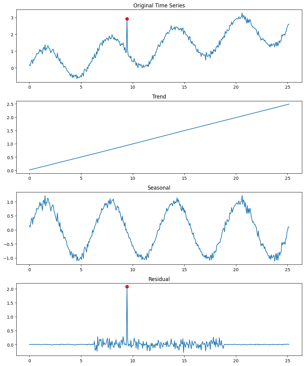 - 残差成分に対して、外れ値検出手法(例:修正されたZ-スコア法)を適用し、異常気象イベントを検出します。