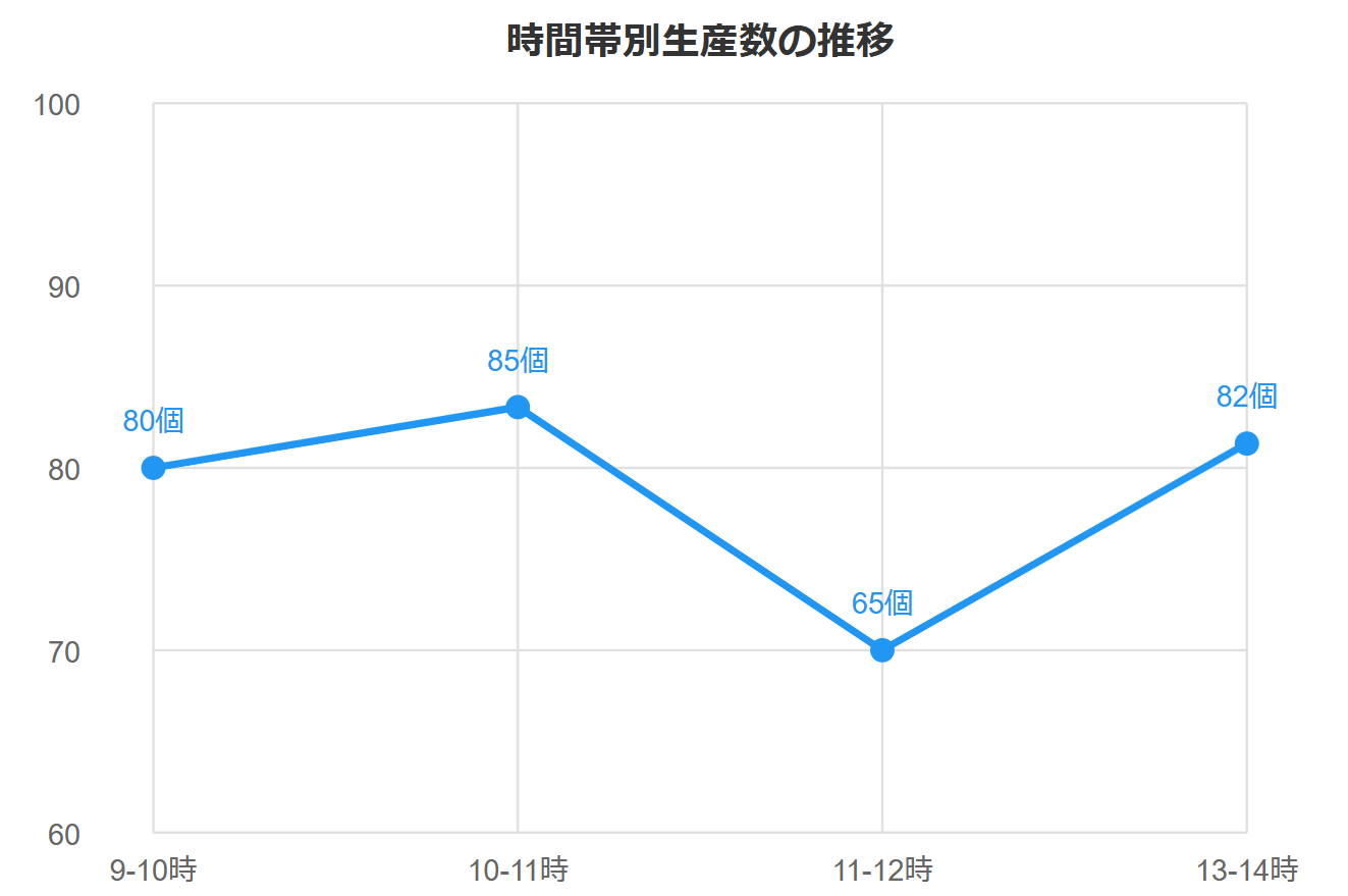このデータを簡単なグラフで可視化することで、中間検査工程がボトルネックになっているという重要な発見がありました。