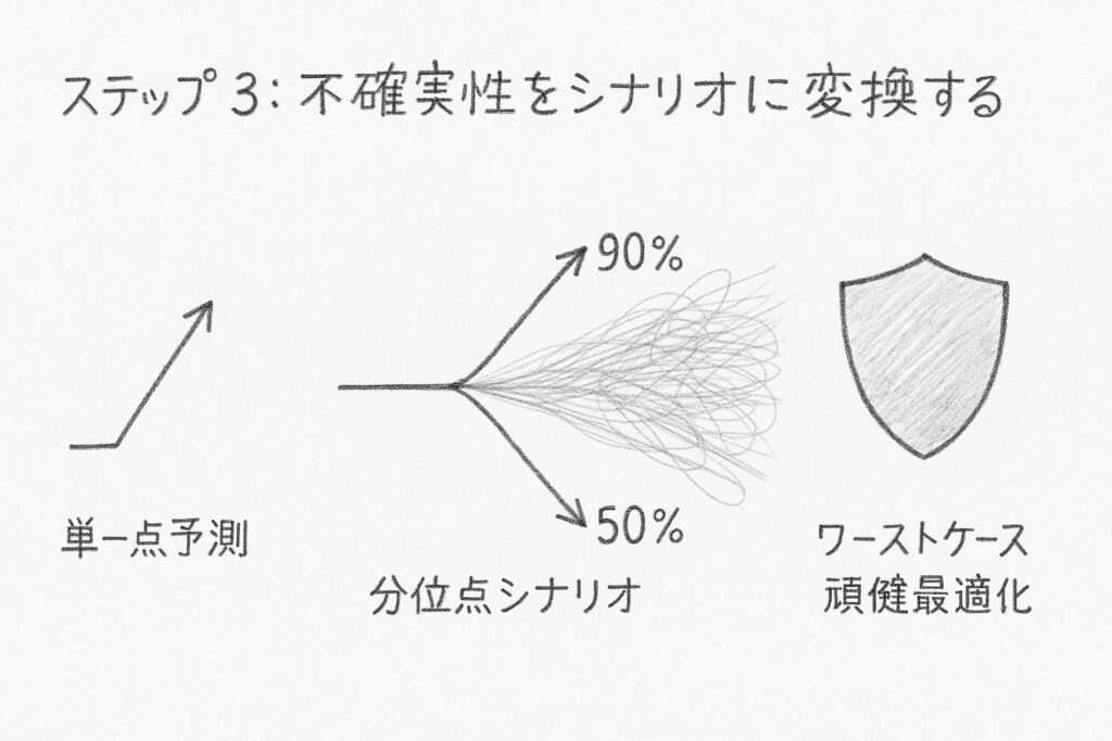 p10、p50、p90などの代表値に縮約し、重要なシナリオのみを採用することで、計算負荷を管理可能な範囲に抑えられます。