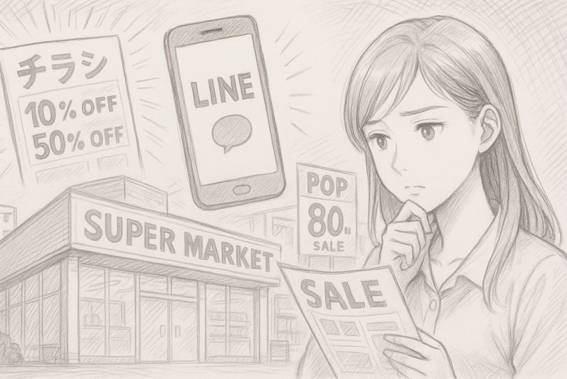 チラシやLINEは来店を促す効果がありますが、何を買うかは店内で決める消費者が多いのです。