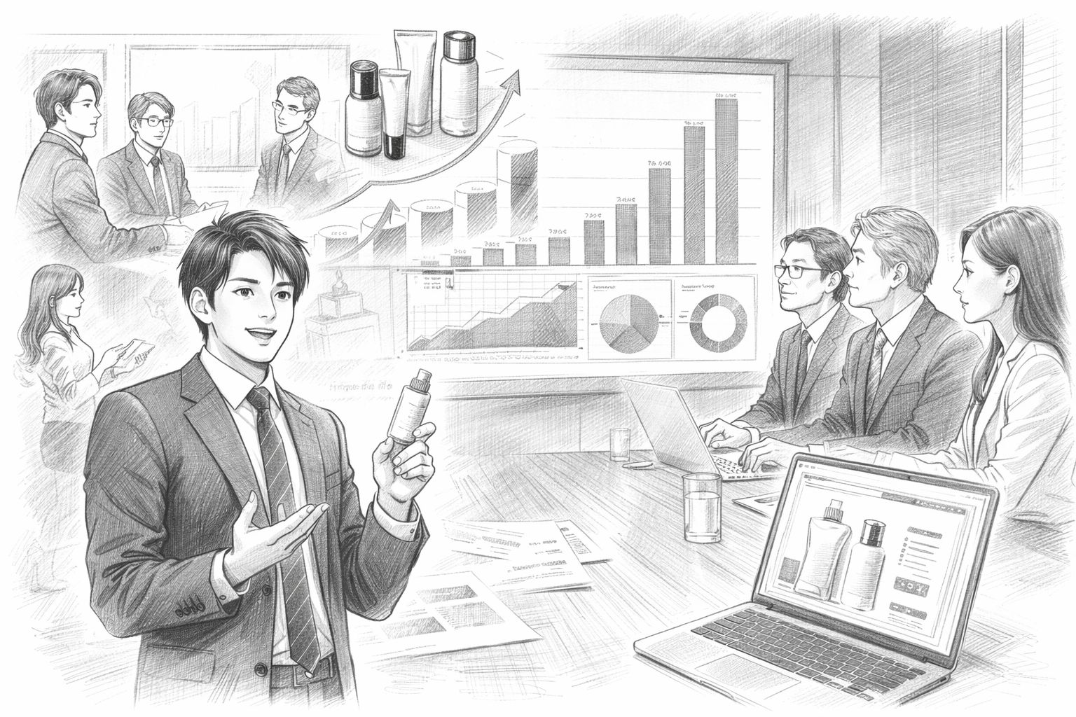 I社の既存ブランドイメージに縛られず、20〜30代の美容意識の高い男性に向けて、新しい価値を提案する。ECサイトでの直販を主軸に、サブスクリプションモデルで顧客との継続的な関係を築く。