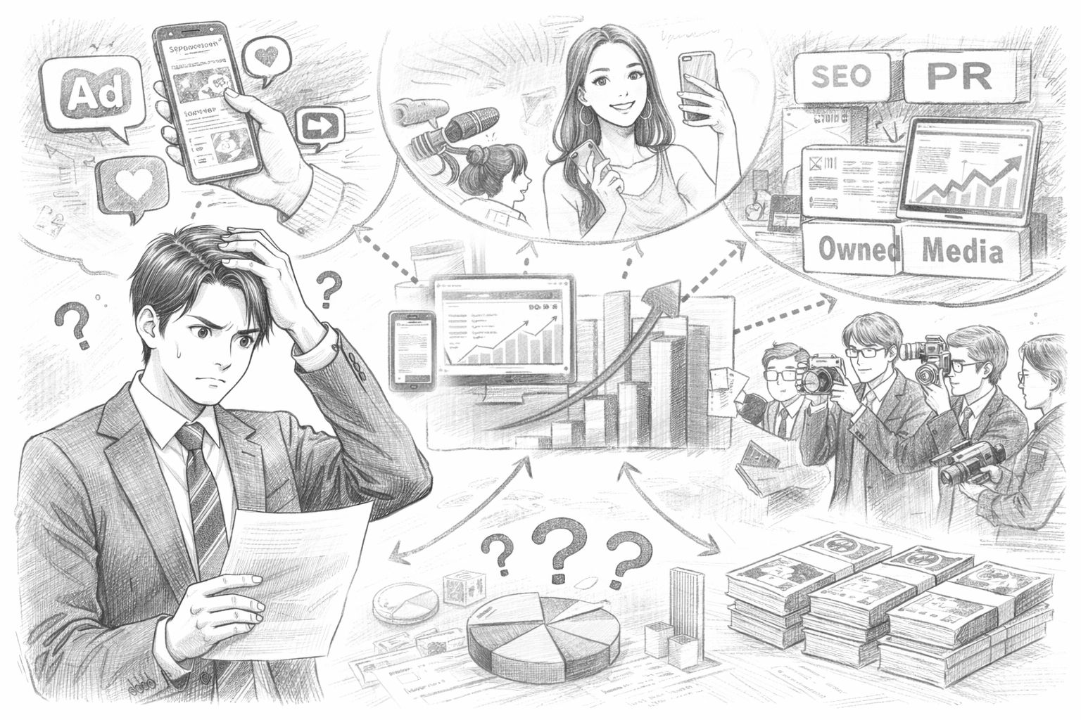 認知を獲得するためにSNS広告を出稿し、信頼性を高めるためにインフルエンサーを起用し、メディア露出を狙ってPR活動を展開し、長期的なSEO流入を獲得するためにオウンドメディアを運営する。
