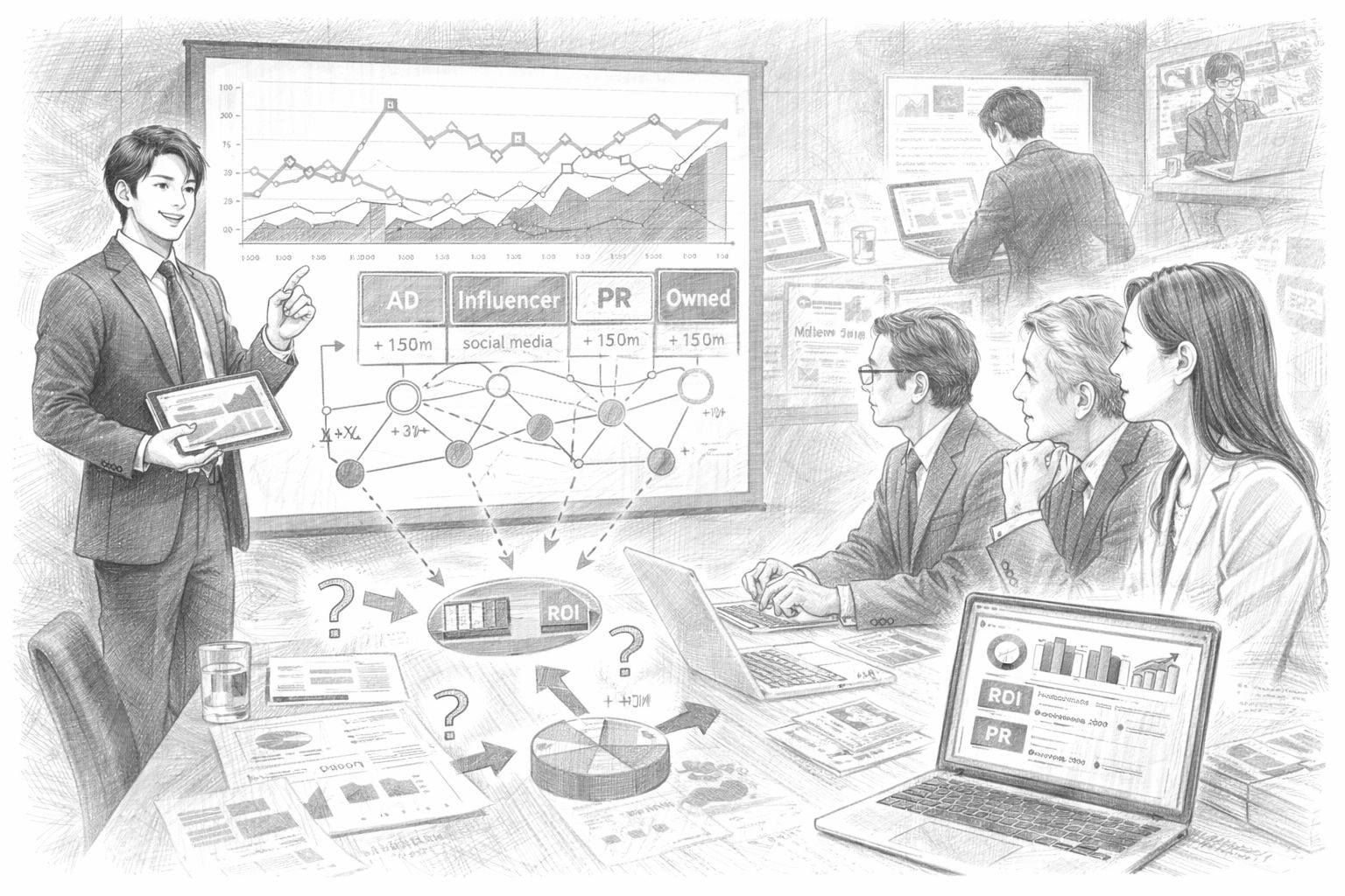 「インフルエンサー施策のROIは○○です。短期的な効果は高いですが、持続性が低いため、戦略的なタイミングに集中する運用に切り替えました」