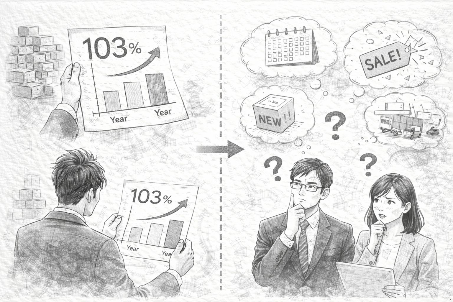 それにもかかわらず、多くの会議では「前年比103%」という数字が提示された時点で、「まあ悪くない」という空気が生まれ、それ以上深掘りされることなく次の議題に移ります。