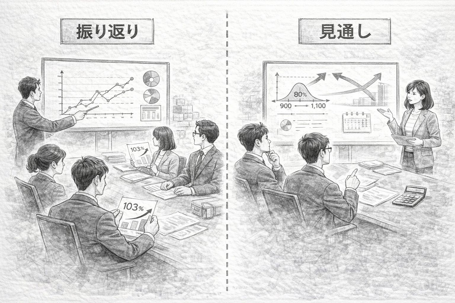 ここから一歩抜け出すには、会議で扱う情報を「過去の振り返り」と「未来の見通し」に分け、見通しの議論のために素朴な基準値を一つ用意するだけで十分です。