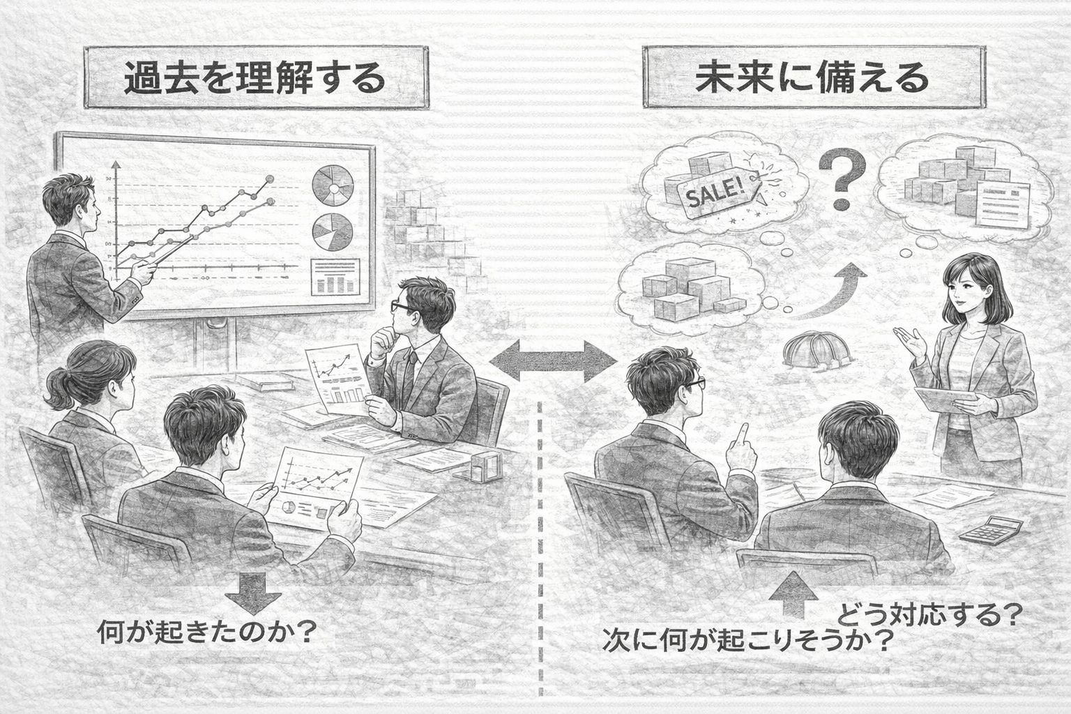 - 「過去を理解する」方向: 何が起きたのか、なぜ起きたのか、それは一時的なのか構造的なのかを把握する。これが振り返り分析です。