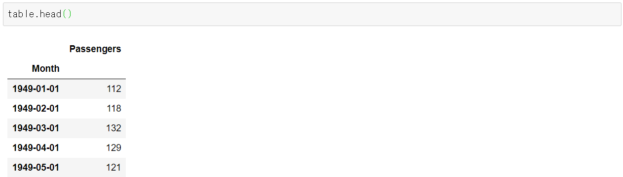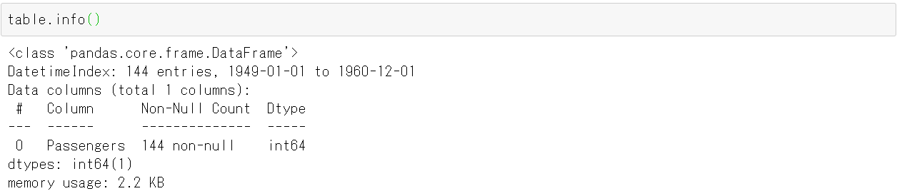 データフレーム型(DataFrame)で、変数は「Passengers」のみで、データ数(行)は144あり、データの型は整数型(int64)であることが分かります。